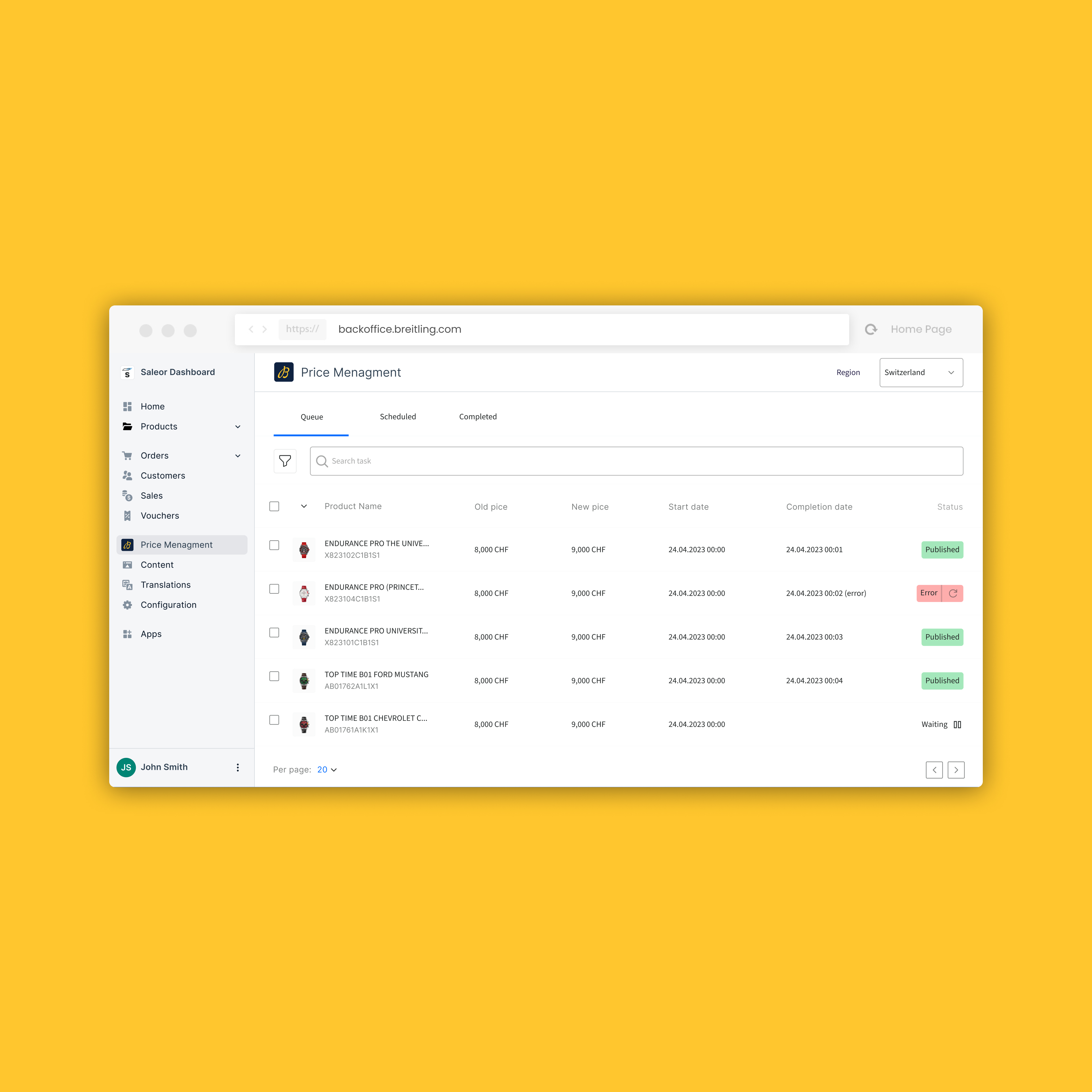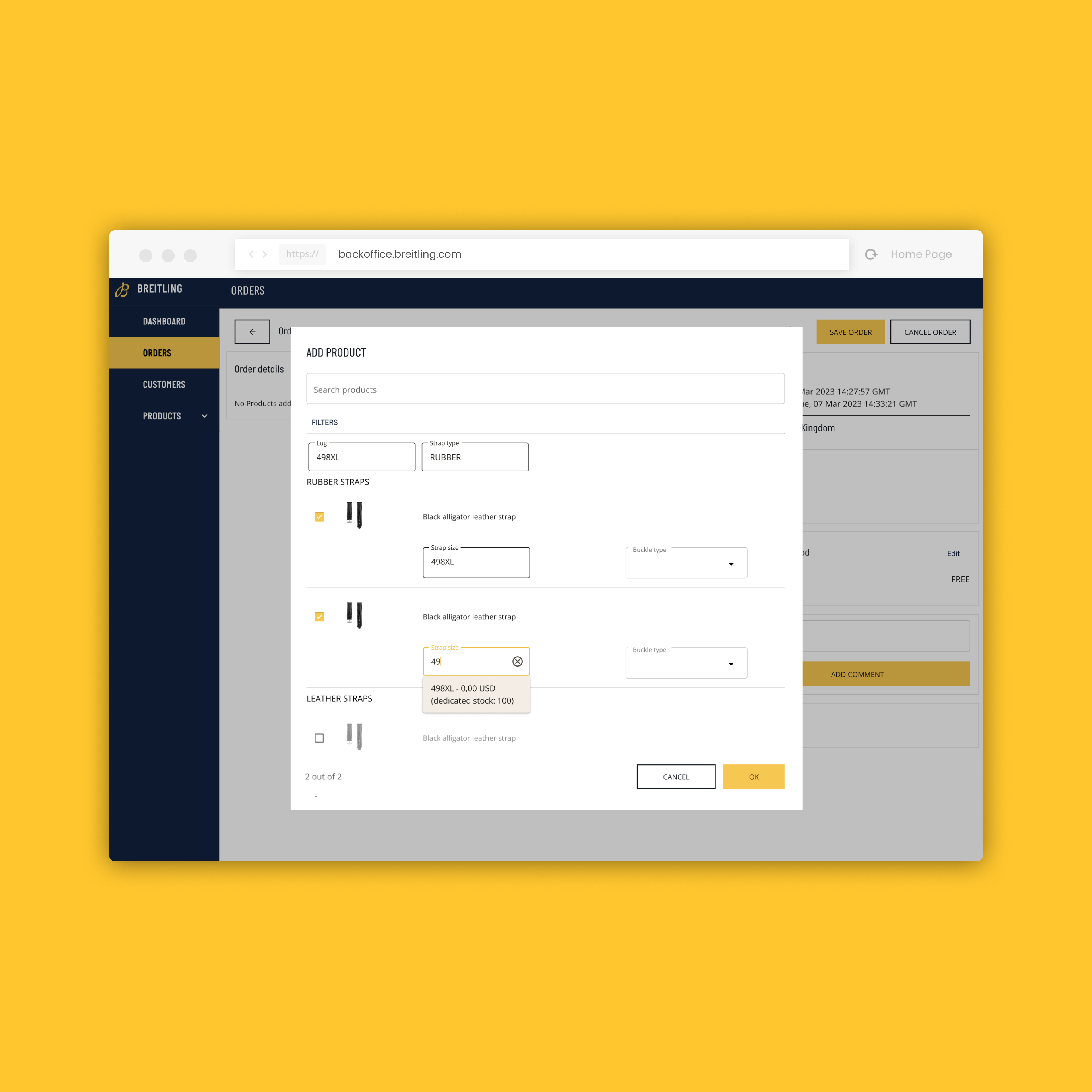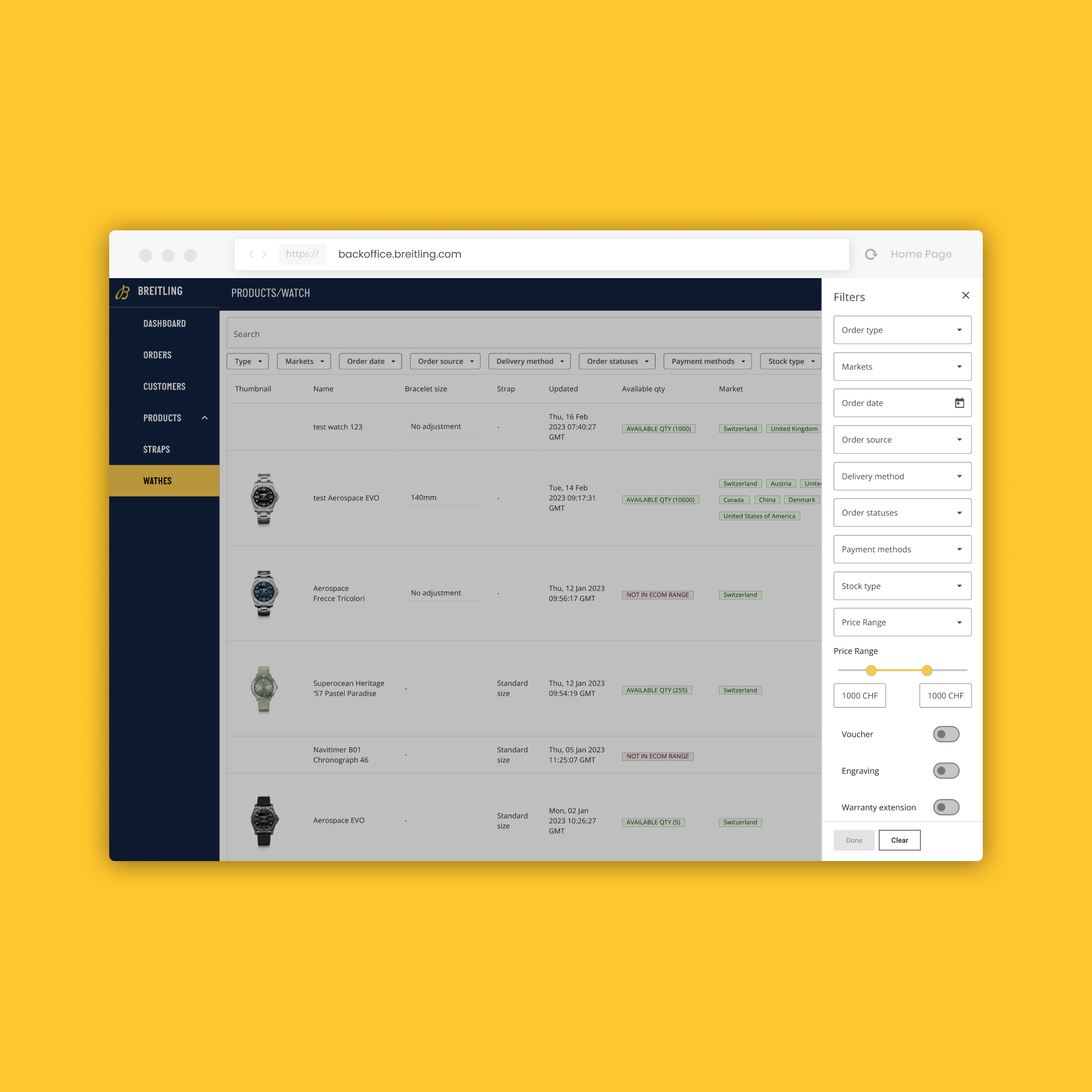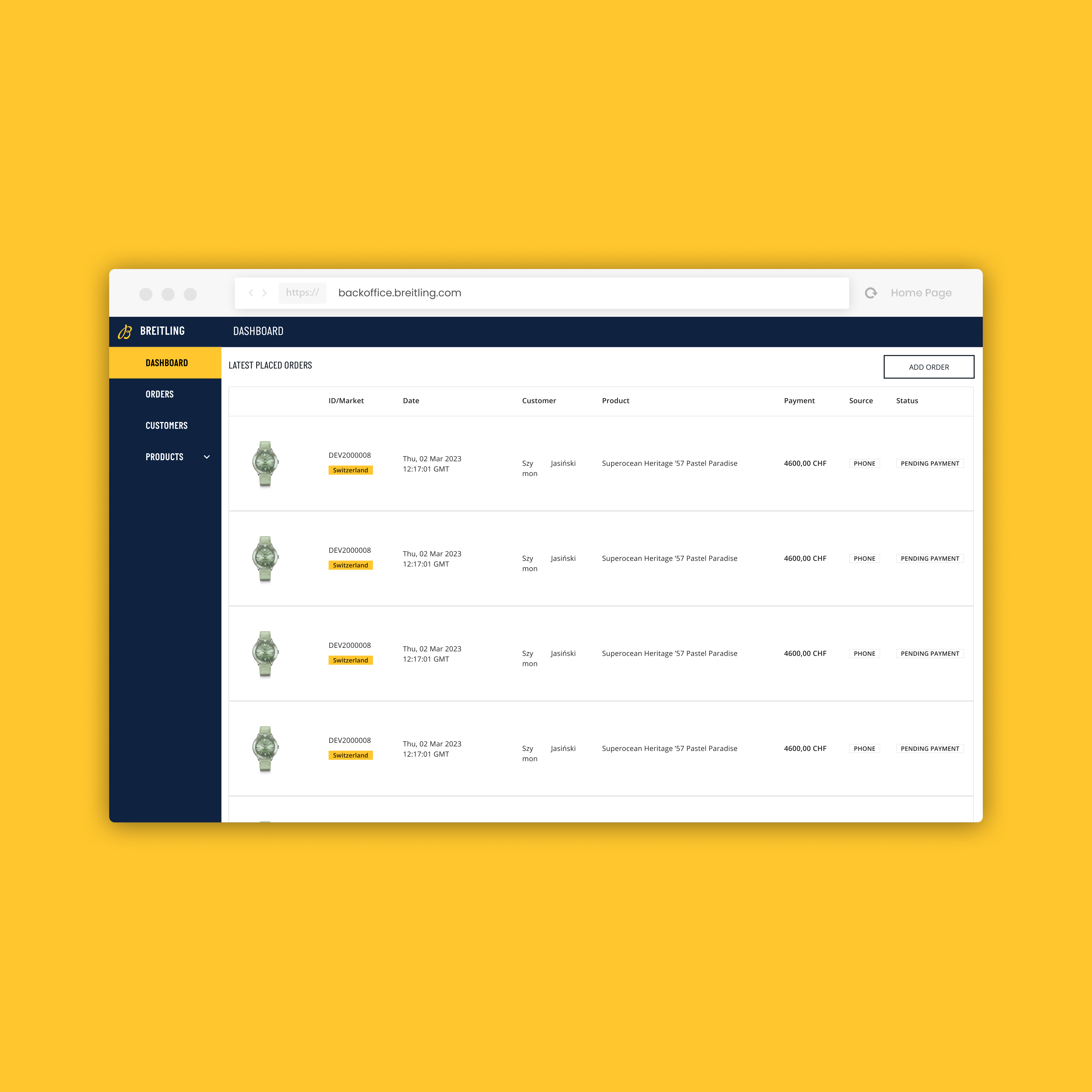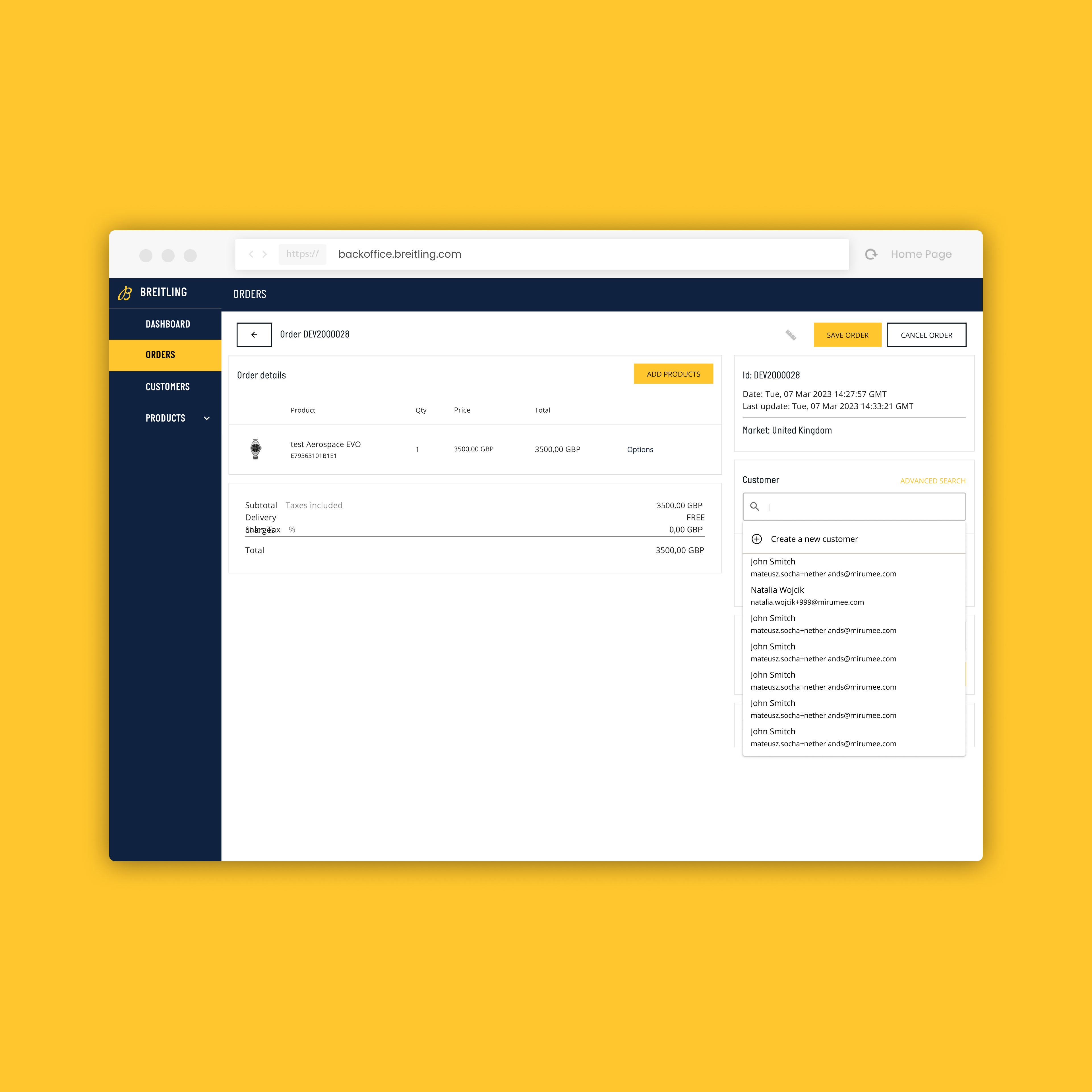 W ramach Projektu Breitling zaprojektowałem funkcjonalności dla zaplecza sklepu internetowego breitling.com. Zaprojektowałem aplikację "Price Management" do Saleor, która umożliwia administratorowi kontrolę nad synchronizacją cen między bazami danych. Stworzyłem również nowy mechanizm przypisywania klienta do zamówienia w systemie sklepowym. Dodatkowo zaimplementowałem funkcję dodawania produktów i konfigurowania zestawów pasków (strap paków). Zwieńczeniem projektu było opracowanie nowego menu filtrowania katalogu produktów, ułatwiające pracownikom wyszukiwanie.