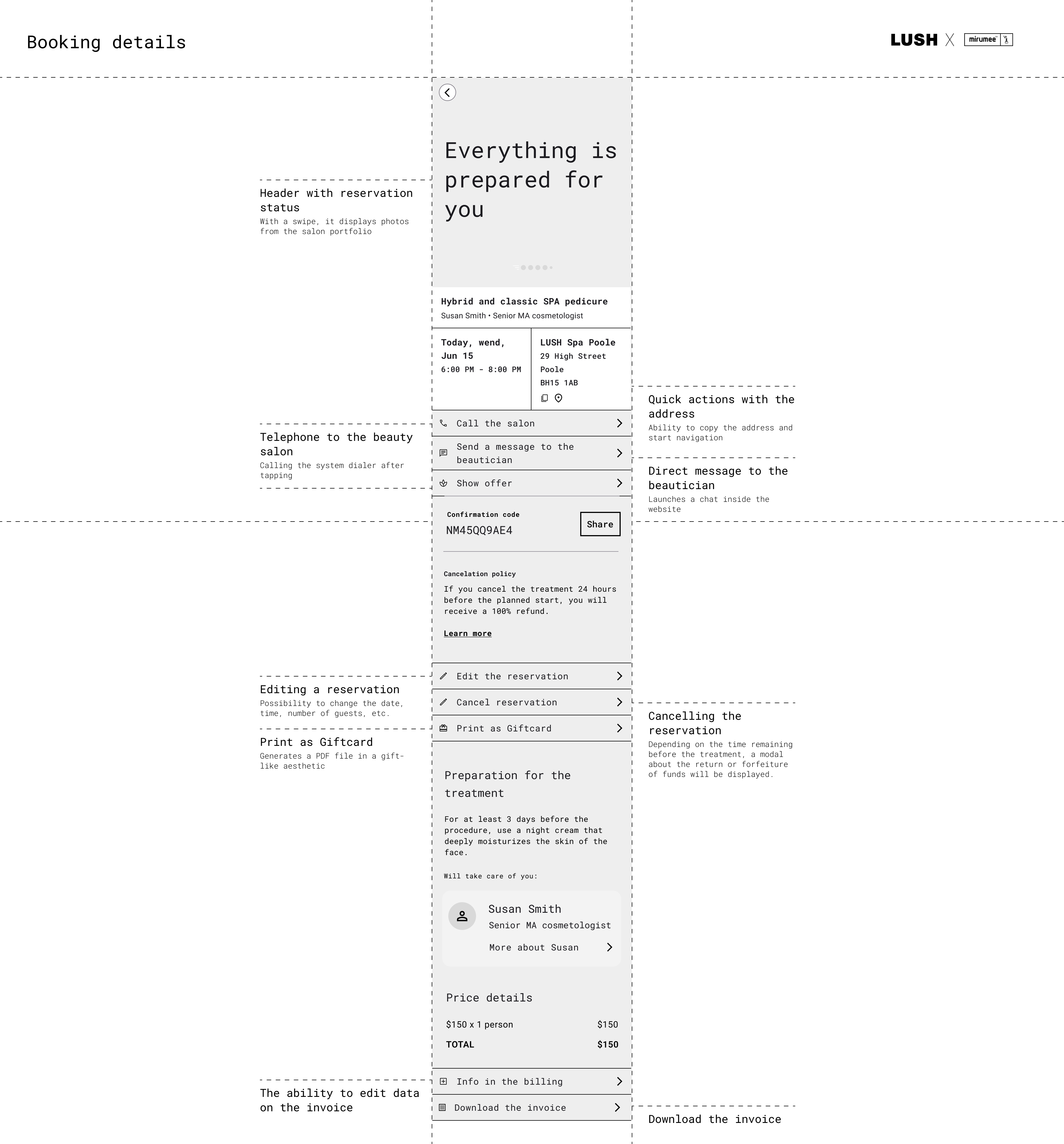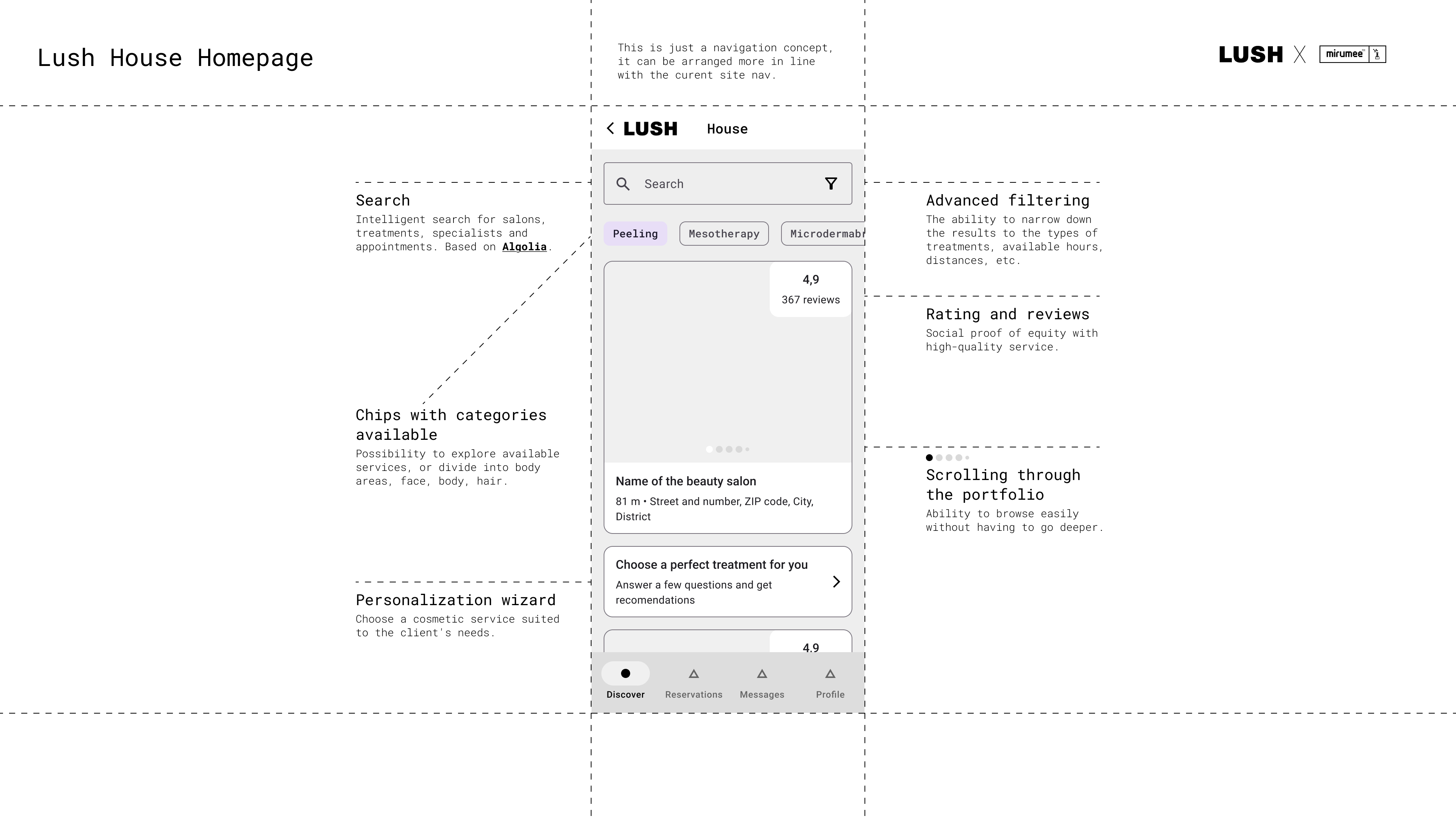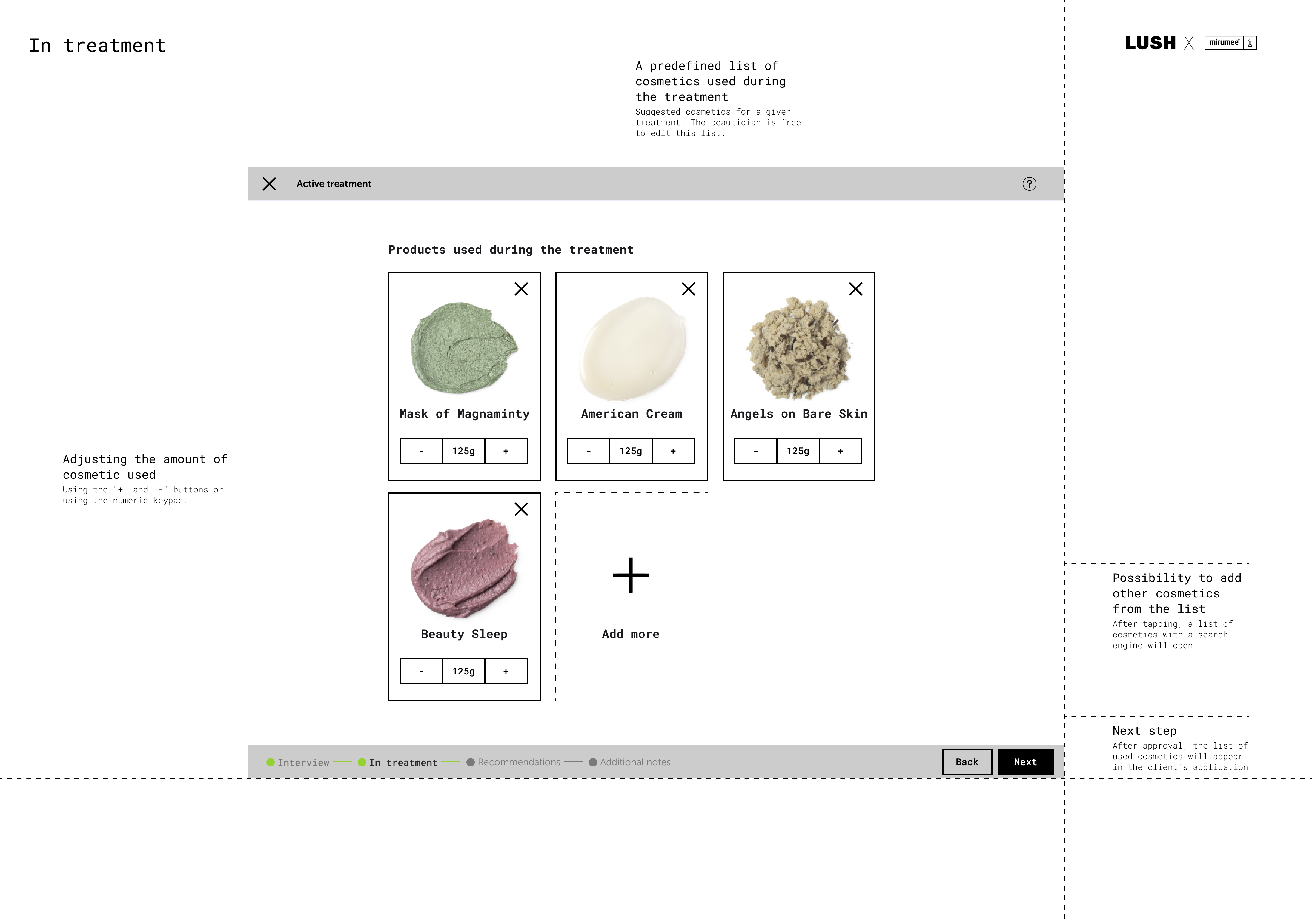 Projekt polegał na stworzeniu konceptu UX (Wireframe) dla nowej usługi LUSH House - systemu, który umożliwia klientom rezerwację wizyt na zabiegi kosmetyczne i dobór odpowiednich produktów LUSH. Celem projektu było zapewnienie klientom wygodnego i przyjemnego doświadczenia, które zachęci ich do korzystania z usług LUSH i zakupu ich produktów. Użytkownik może wybrać rodzaj i czas zabiegu, a następnie zobaczyć dostępność i lokalizację najbliższego salonu LUSH. Może również zapoznać się z profilami i opiniami kosmetyczek, które będą wykonywać zabiegi. Użytkownik ma możliwość zmiany lub anulowania wizyty w dowolnym momencie przed jej rozpoczęciem. Po zabiegu użytkownik otrzymuje spersonalizowane rekomendacje produktów LUSH, które są dopasowane do jego typu skóry, preferencji i celów. Użytkownik może zamówić produkty online lub kupić je w sklepie, korzystając z kodu rabatowego. Użytkownik może również ocenić wizytę i podzielić się swoją opinią z innymi klientami i kosmetyczką. System składa się z dwóch części: web aplikacji dla klientów, która umożliwia rezerwację, podgląd i edycję wizyt, oraz panelu na tablecie dla kosmetyczek, który pozwala na zarządzanie wizytami i dobieranie produktów. Koncept UX uwzględnia różne scenariusze użytkowania, takie jak pierwsza wizyta, kolejna wizyta, anulowanie wizyty, zmiana terminu, zmiana salonu, zmiana zabiegu, zmiana kosmetyczki, ocena wizyty, zakup produktów, otrzymanie wiadomości od kosmetyczki. Każdy scenariusz jest opisany krok po kroku, z uwzględnieniem interakcji między użytkownikiem, kosmetyczką i systemem.