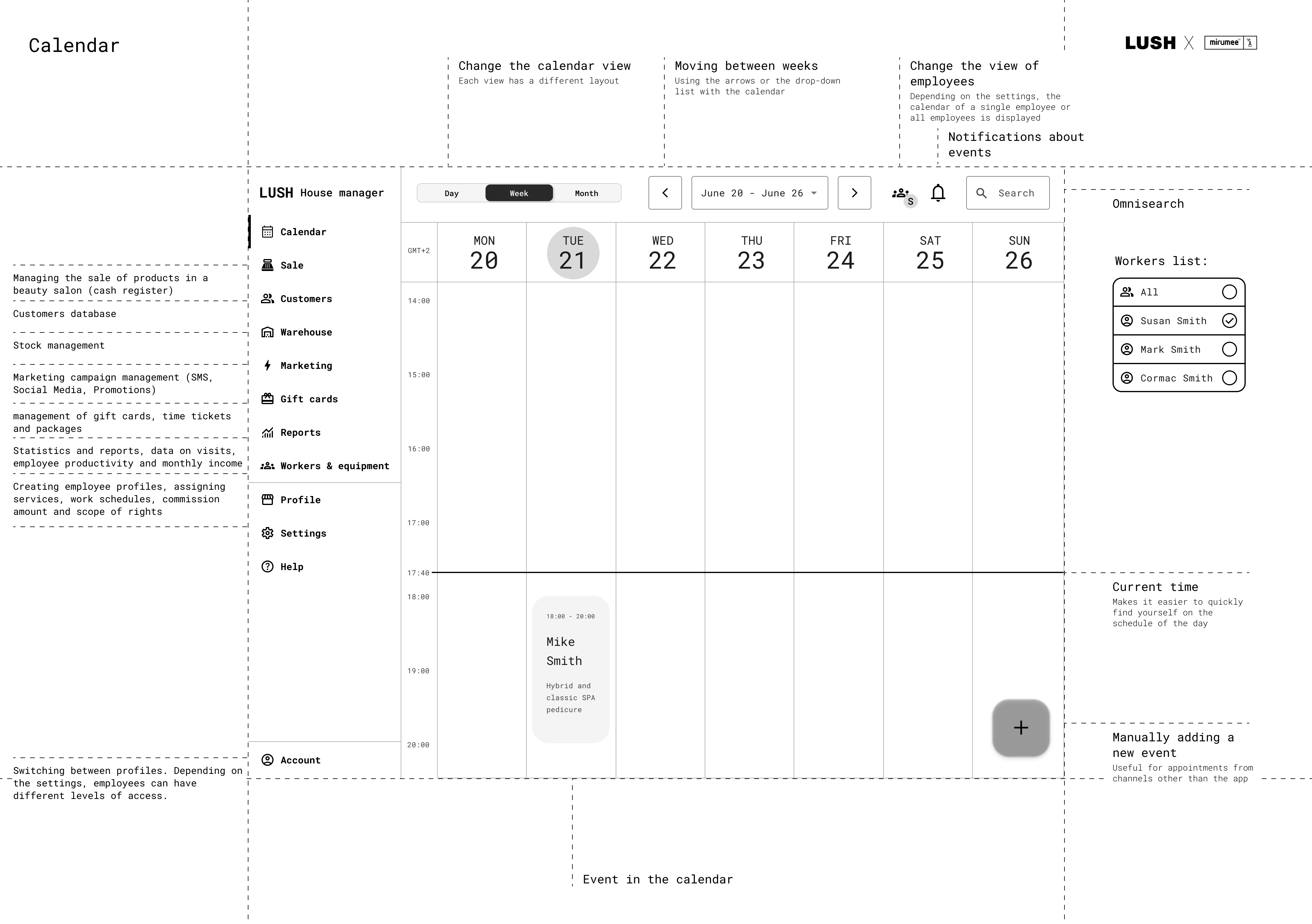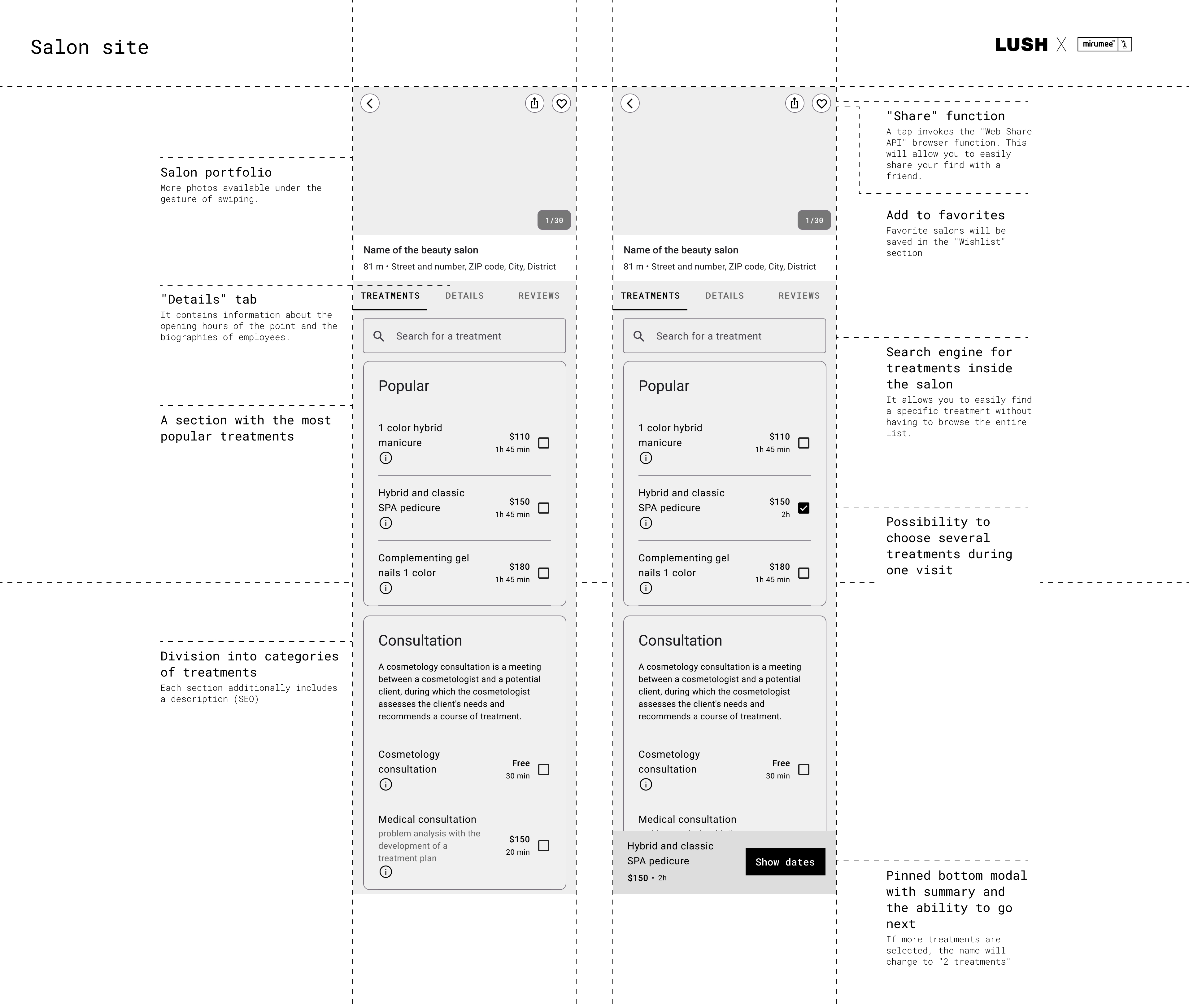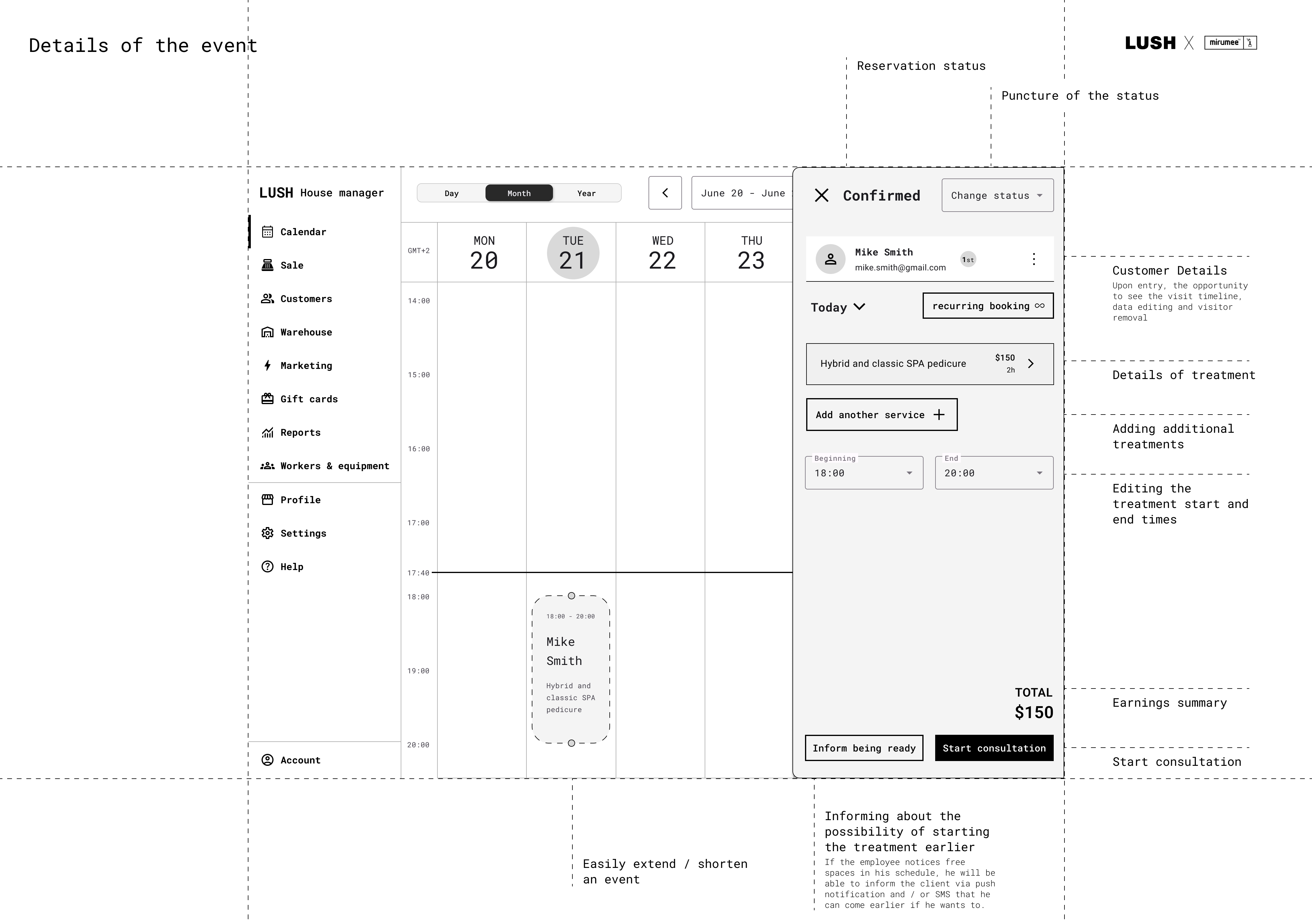 Projekt polegał na stworzeniu konceptu UX (Wireframe) dla nowej usługi LUSH House - systemu, który umożliwia klientom rezerwację wizyt na zabiegi kosmetyczne i dobór odpowiednich produktów LUSH. Celem projektu było zapewnienie klientom wygodnego i przyjemnego doświadczenia, które zachęci ich do korzystania z usług LUSH i zakupu ich produktów. Użytkownik może wybrać rodzaj i czas zabiegu, a następnie zobaczyć dostępność i lokalizację najbliższego salonu LUSH. Może również zapoznać się z profilami i opiniami kosmetyczek, które będą wykonywać zabiegi. Użytkownik ma możliwość zmiany lub anulowania wizyty w dowolnym momencie przed jej rozpoczęciem. Po zabiegu użytkownik otrzymuje spersonalizowane rekomendacje produktów LUSH, które są dopasowane do jego typu skóry, preferencji i celów. Użytkownik może zamówić produkty online lub kupić je w sklepie, korzystając z kodu rabatowego. Użytkownik może również ocenić wizytę i podzielić się swoją opinią z innymi klientami i kosmetyczką. System składa się z dwóch części: web aplikacji dla klientów, która umożliwia rezerwację, podgląd i edycję wizyt, oraz panelu na tablecie dla kosmetyczek, który pozwala na zarządzanie wizytami i dobieranie produktów. Koncept UX uwzględnia różne scenariusze użytkowania, takie jak pierwsza wizyta, kolejna wizyta, anulowanie wizyty, zmiana terminu, zmiana salonu, zmiana zabiegu, zmiana kosmetyczki, ocena wizyty, zakup produktów, otrzymanie wiadomości od kosmetyczki. Każdy scenariusz jest opisany krok po kroku, z uwzględnieniem interakcji między użytkownikiem, kosmetyczką i systemem.