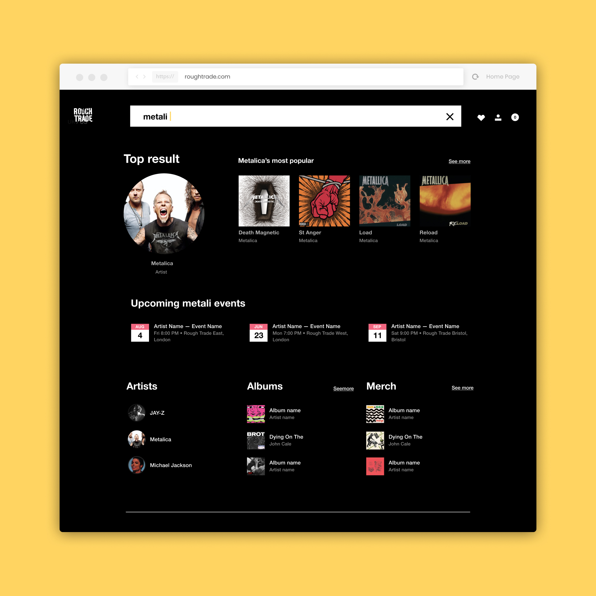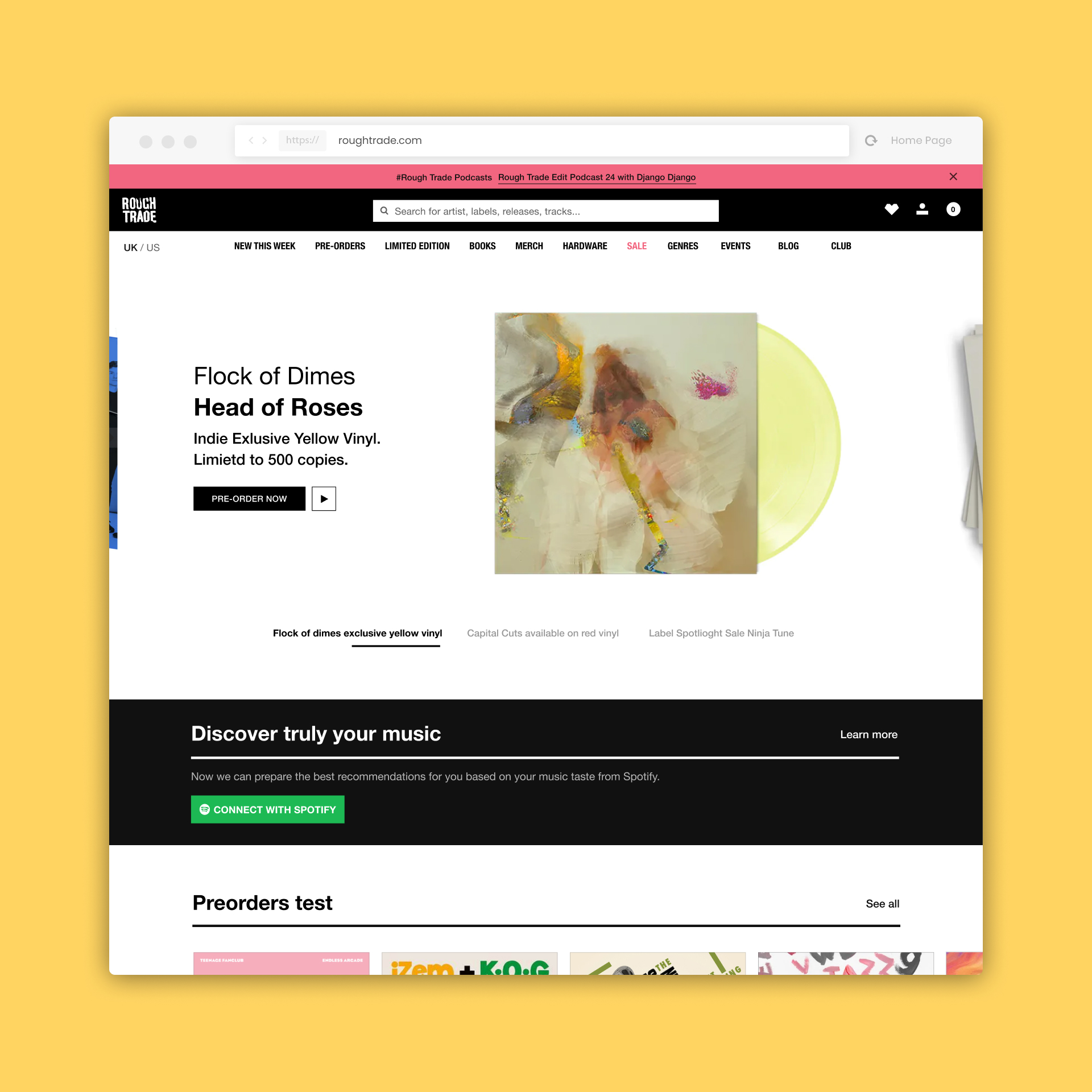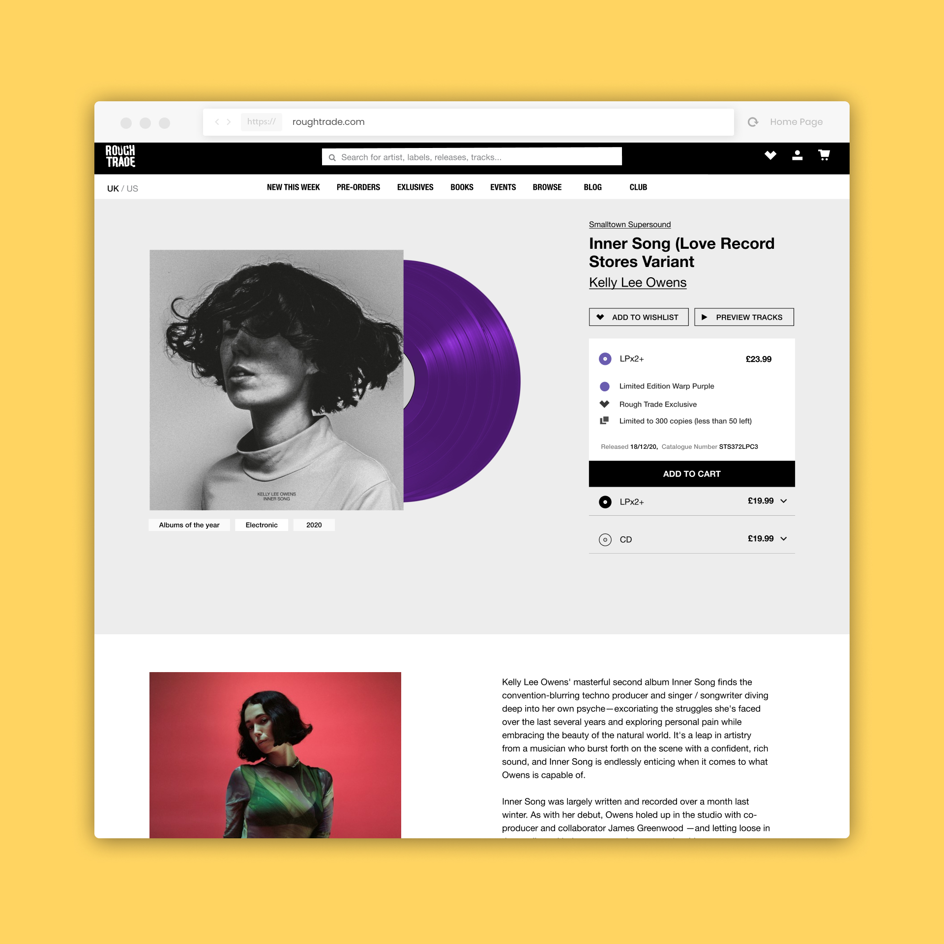 Wyzwanie polegało na stworzeniu atrakcyjnej, intuicyjnej i nowoczesnej strony, która odzwierciedlałaby kulturę i wartości Rough Trade, a także ułatwiała użytkownikom odkrywanie i kupowanie muzyki w różnych formatach. Aby sprostać temu zadaniu, wraz z zespołem Mirumee zaprojektowałem wiele elementów i funkcji strony, takich jak nowa strona główna sklepu, nowa imersyjna wyszukiwarka, nowa nawigacja po kategoriach, mechanizm wyboru nośnika, miniodtwarzacz do odsłuchiwania utworów, konto klienta, strona bloga, zarządzanie kolekcjami, checkout, mechanizm dodawania produktów do koszyka, rejestrację, tworzenie playlist Spotify, wyszukiwanie po gatunkach, strony artystów i wiele więcej.