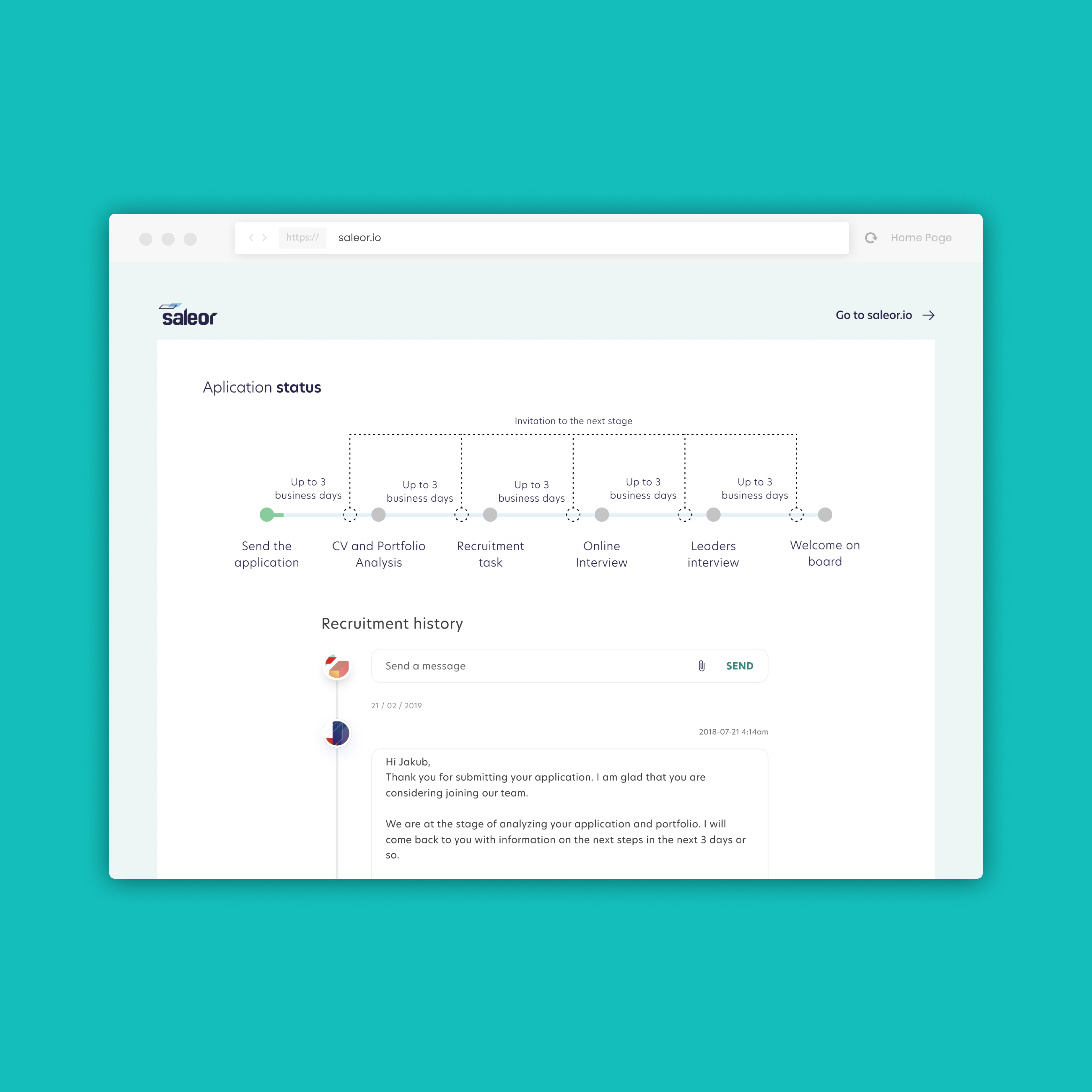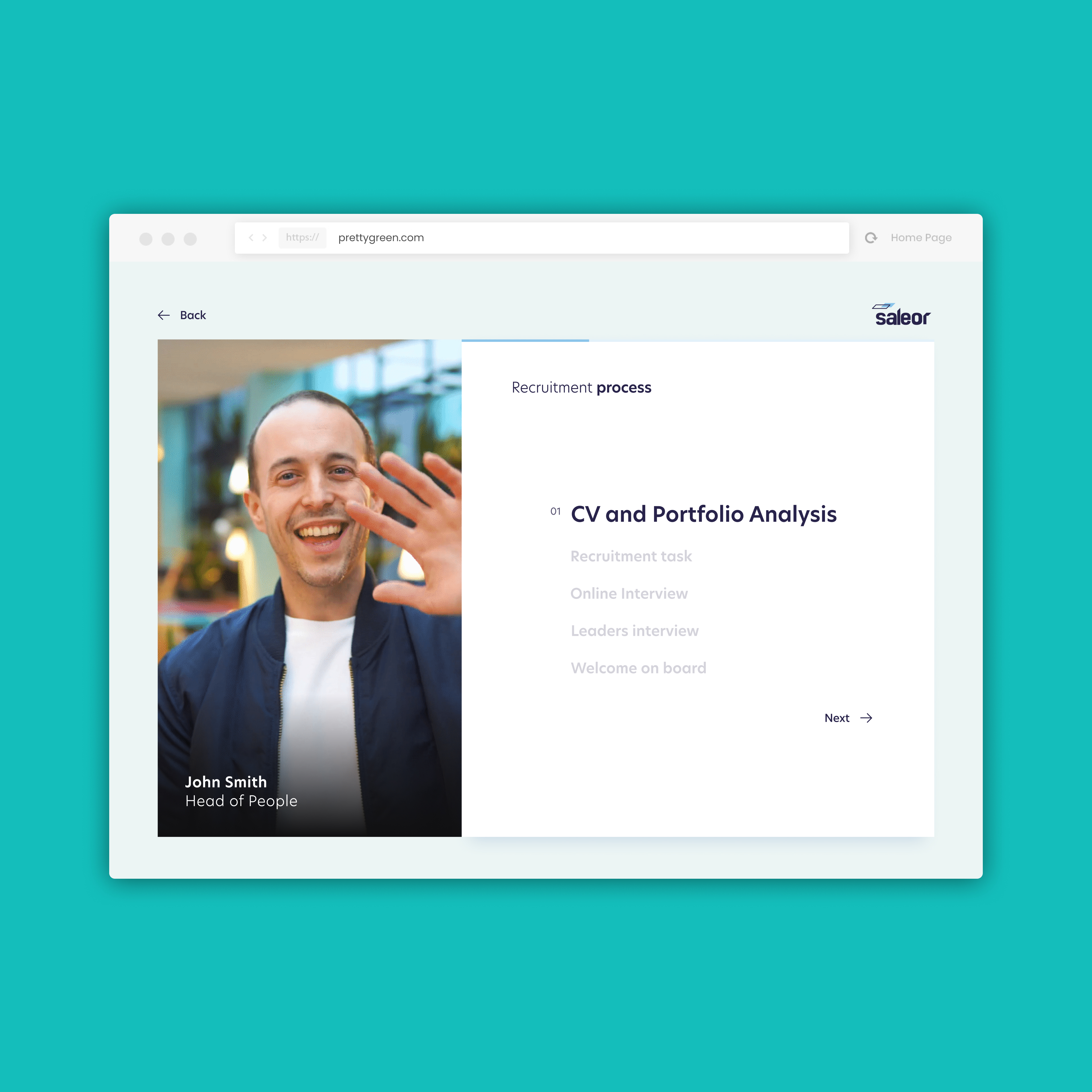 Formularz zawiera kolumnę z wideo, w której rekruter opowiada o poszczególnych etapach procesu rekrutacji, takich jak test techniczny, rozmowa z zespołem, czy prezentacja projektu. Użytkownik przechodząc na kolejne podstrony formularza, uruchamia ciąg dalszy nagrania, który dostosowuje się do aktualnego etapu. Opcjonalnie użytkownik może również nagrać swoją krótką wypowiedź, w ramach której opowiada o tym, dlaczego chce pracować w Saleor, co pozwala na lepsze poznanie kandydata i jego motywacji.