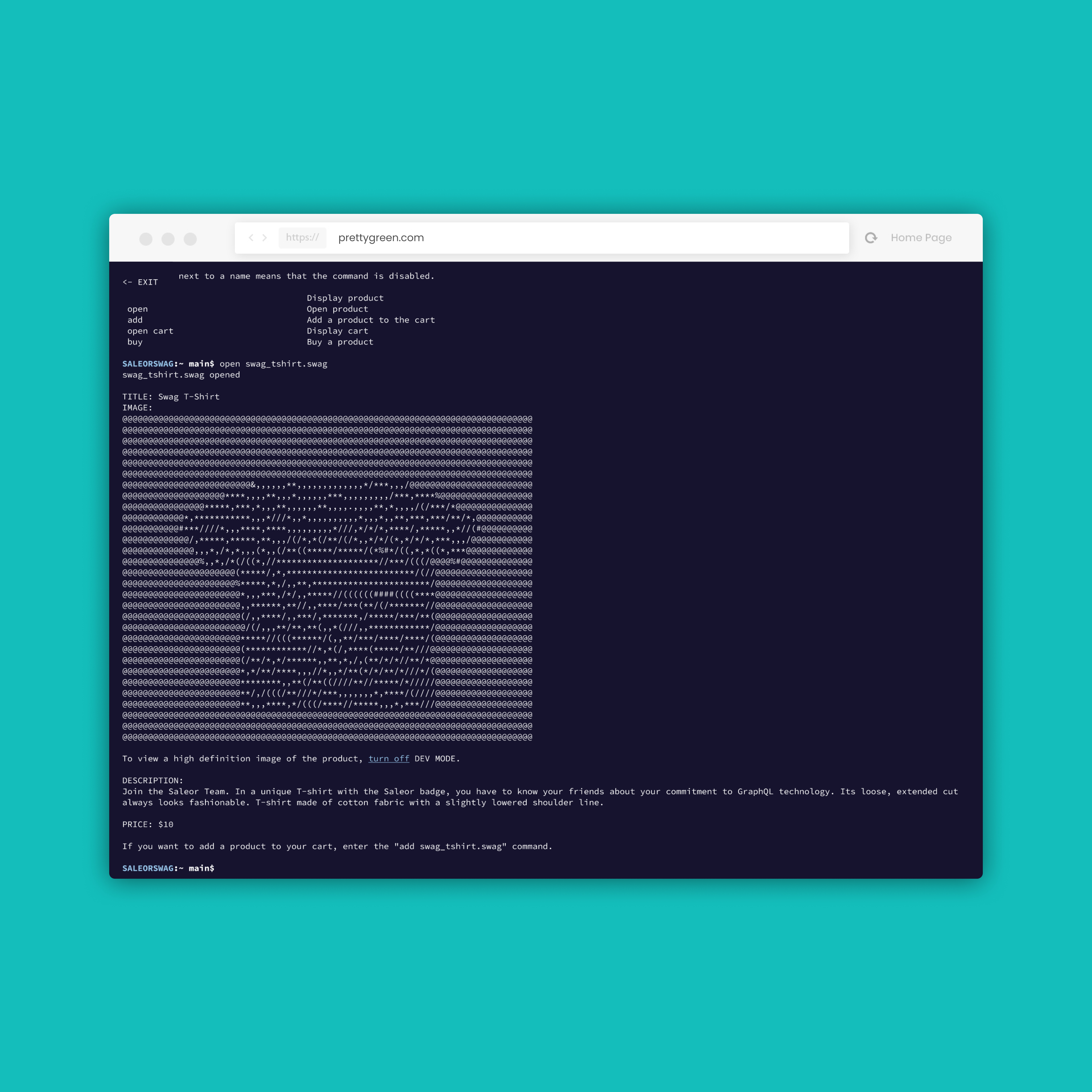 Użytkownik może nie tylko korzystać z interfejsu graficznego, ale także z symulacji Terminala, która daje mu większą kontrolę i swobodę. Użytkownik może przełączyć się na symulację Terminala, naciskając klawisz ~ lub klikając w pasek na dole ekranu. W terminalu może wykonywać wszystkie czynności jak w normalnym sklepie, używając poleceń tekstowych. Użytkownik może np. wyszukiwać produkty, dodawać je do koszyka, sprawdzać stan zamówienia, czy kontaktować się z obsługą klienta, wpisując odpowiednie komendy. W trybie graficznym każda czynność jest też obrazowana w podglądzie terminala w dolnym pasku. Symulacja Terminala jest nie tylko funkcjonalna i wygodna, ale także zabawna i oryginalna, ponieważ odwołuje się do kultury geeków i programistów.