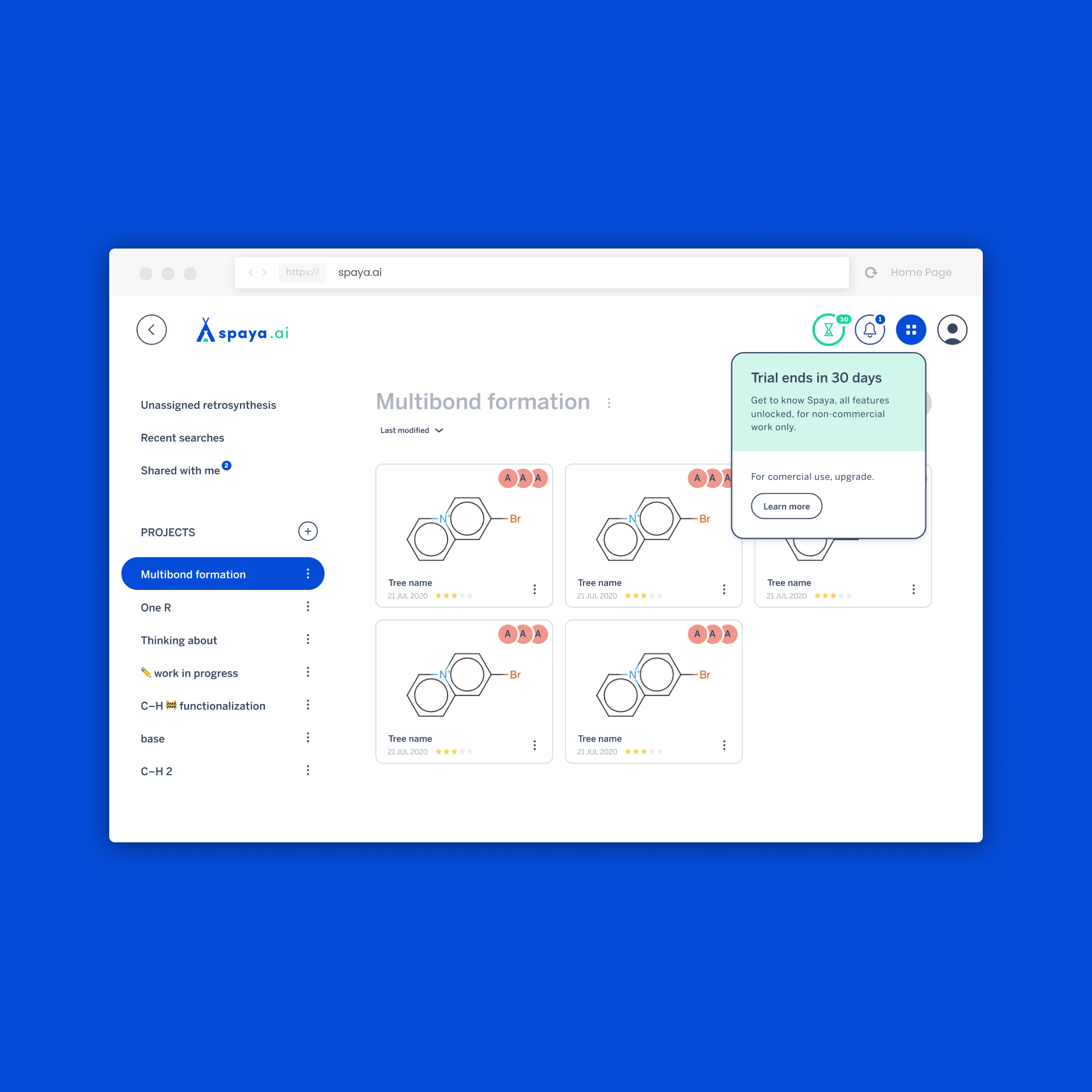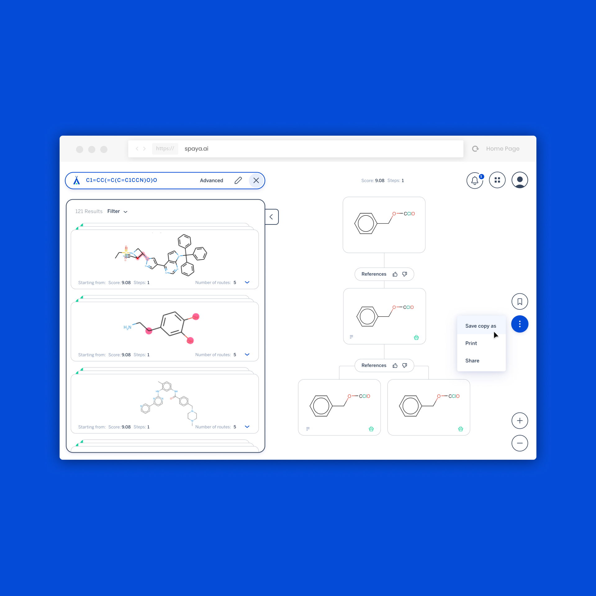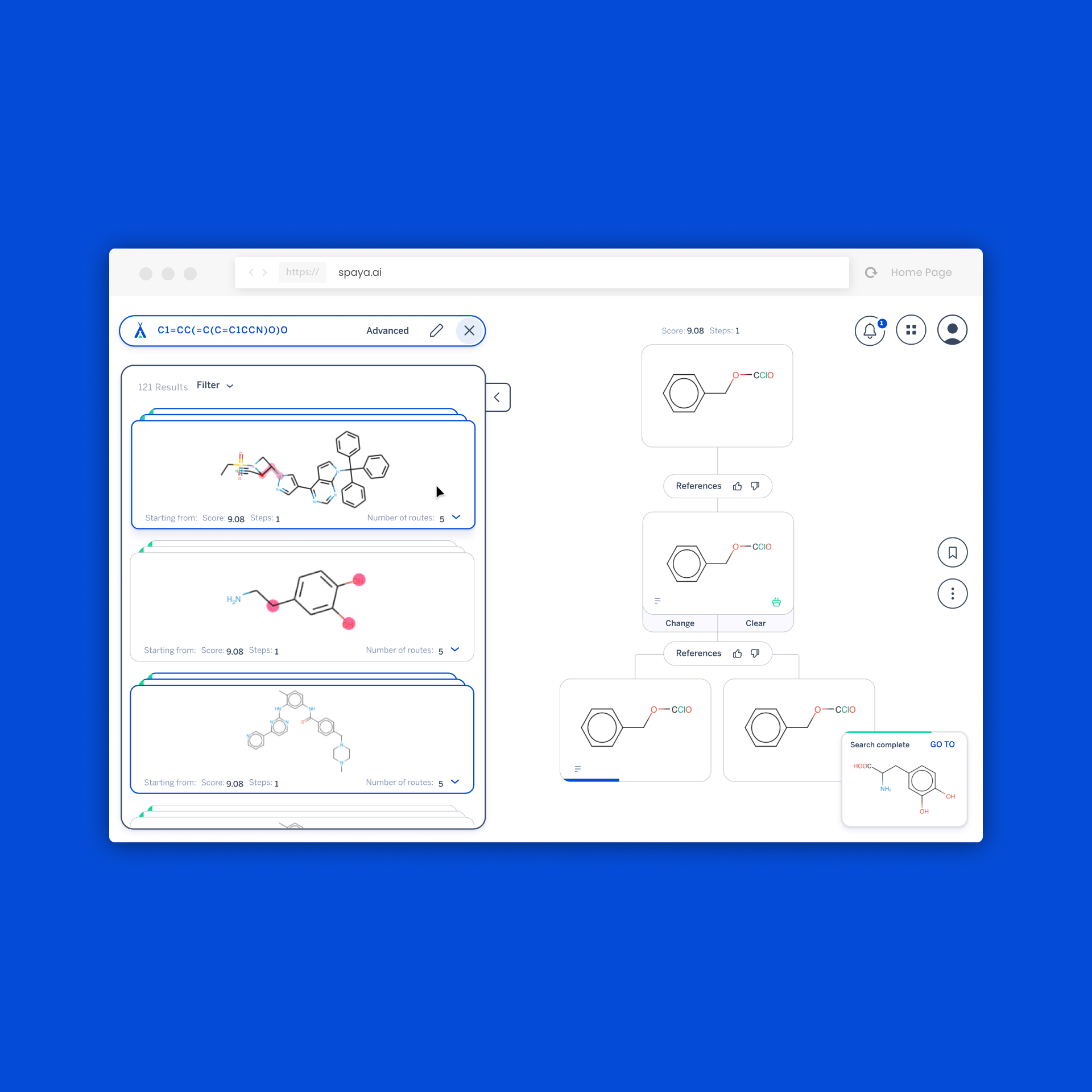 Spaya.ai wykorzystuje sztuczną inteligencję do wyszukiwania i optymalizacji syntez chemicznych. Aby zapewnić użytkownikowi najlepsze wyniki, analizuje wszystkie możliwe ścieżki syntetyczne dla danego związku i ocenia je pod względem różnych kryteriów. Ten proces może potrwać od kilku sekund do kilku minut, w zależności od złożoności związku i ilości dostępnych danych. Aby użytkownik nie czekał w napięciu, Spaya.ai pokazuje mu częściowe dane oraz informację o postępach wyszukiwania na pasku postępu. Jeśli użytkownik przejdzie do innego ekranu aplikacji, nadal kontynuuje wyszukiwanie w tle i powiadomi go o zakończeniu wyszukiwania za pomocą komunikatu. Użytkownik może wtedy wrócić do ekranu wyszukiwania i zobaczyć pełne wyniki.