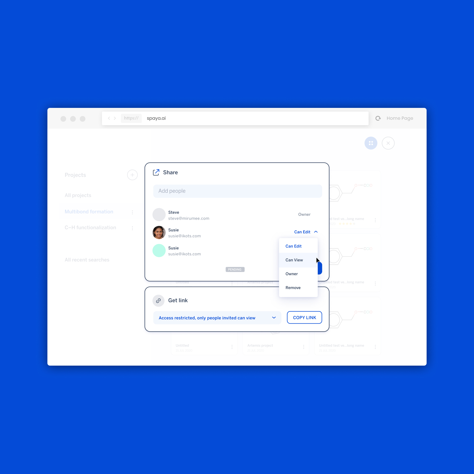 Udostępnianie projektu Spaya.ai nie tylko pomaga w współpracy i wymianie pomysłów z innymi użytkownikami. Każdy projekt, który użytkownik tworzy w Spaya, może być udostępniony innym użytkownikom, zarówno wewnątrz jak i na zewnątrz organizacji. Aby udostępnić projekt, wystarczy wpisać adres e-mail osoby, z którą chcemy się podzielić, i wybrać poziom dostępu: tylko do odczytu lub do edycji. Użytkownik, który otrzyma zaproszenie do projektu, będzie mógł zobaczyć i ocenić wyniki wyszukiwania, a także dodać własne komentarze lub sugestie.